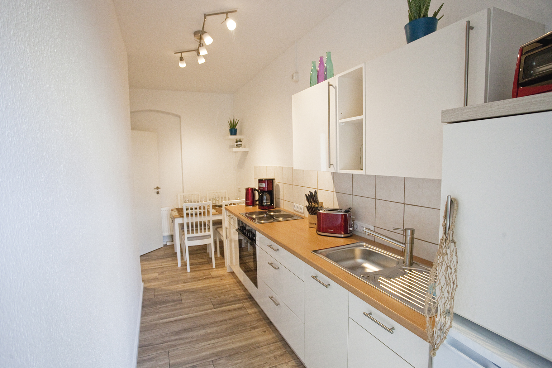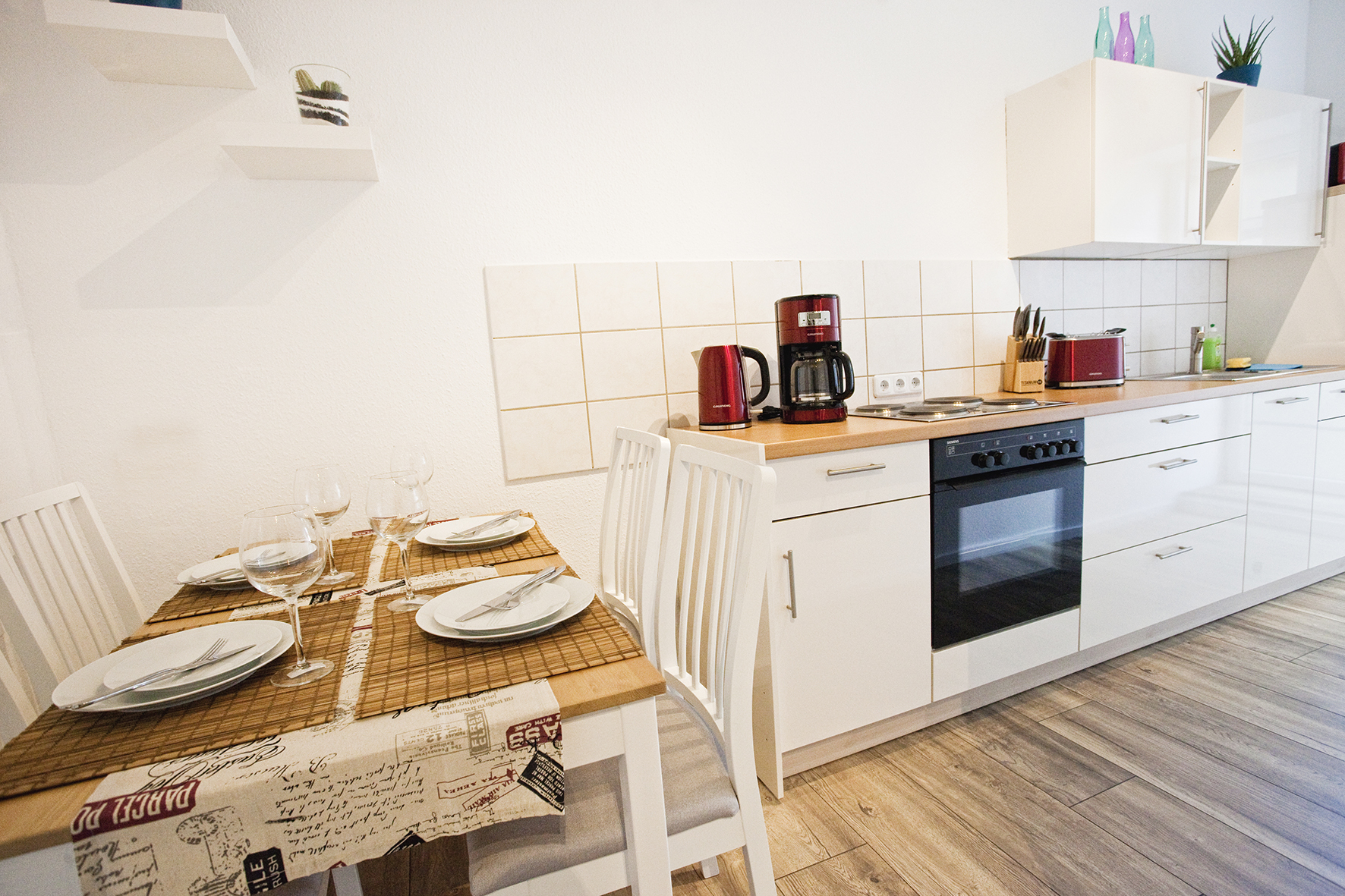 Individuell und modern gestaltet, gehören sowohl der Flachbild-TV als auch die bequemen Ohrensessel zum gemütlichen Komfort. Unsere komplett ausgestattete Küche lässt keine Wünsche offen und überzeugt mit einer Kaffeemaschine, einem Geschirrspüler, einem Cerankochfeld inkl. Backofen sowie einem Kühlschrank. Bereiten Sie einfach Ihre Speisen bequem im Apartment zu und genießen Sie diese in der bequemen Sitzecke oder auf dem angrenzenden Balkon.